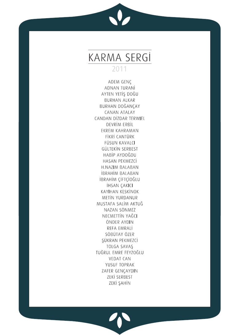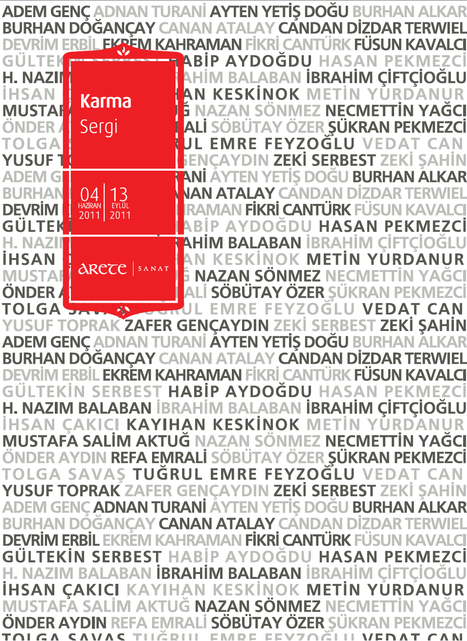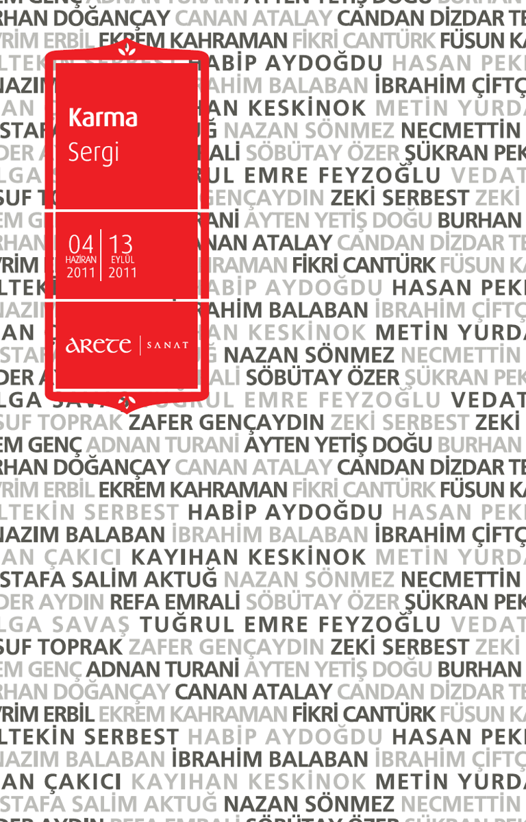 2010-2011 sanat sezonunu Adnan Turani Sergisi ile başlatan, Hayati Misman, Ekrem Kahraman, Hüsamettin Koçan, Süleyman Saim Tekcan, İbrahim Balaban, Zafer Gençaydın, Bahri Genç sergileri ile yoluna devam eden Arete Sanat Galerisi’nde bu ay KARMA SERGİ yer alıyor.