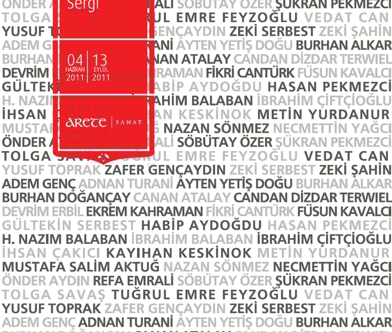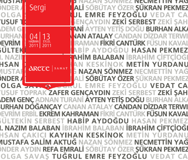 Arete Sanat Galerisi’ndeki Karma Sergi’ de, ADEM GENÇ, ADNAN TURANİ, AYTEN YETİŞ DOĞU, BURHAN ALKAR, BURHAN DOĞANÇAY, CANAN ATALAY, CANDAN DİZDAR TERWIEL, DEVRİM ERBİL, EKREM KAHRAMAN, EMRE FEYZOĞLU, FİKRİ CANTÜRK, FÜSUN KAVALCI, GÜLTEKİN SERBEST, HABİP AYDOĞDU, HASAN PEKMEZCİ, İBRAHİM BALABAN, İBRAHİM ÇİFTÇİOĞLU, İHSAN ÇAKICI, KAYIHAN KESKİNOK, METİN YURDANUR, MUSTAFA SALİM AKTUĞ, NAZAN SÖNMEZ, NAZIM BALABAN, NECMETTİN YAĞCI, ÖNDER AYDIN, REFA EMRALİ, SÖBÜTAY ÖZER, ŞÜKRAN PEKMEZCİ, TOLGA SAVAŞ, VEDAT CAN, YUSUF TOPRAK, ZAFER GENÇAYDIN, ZEKİ SERBEST, ZEKİ ŞAHİN yer alacaktır.