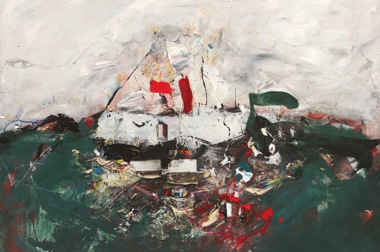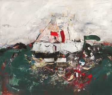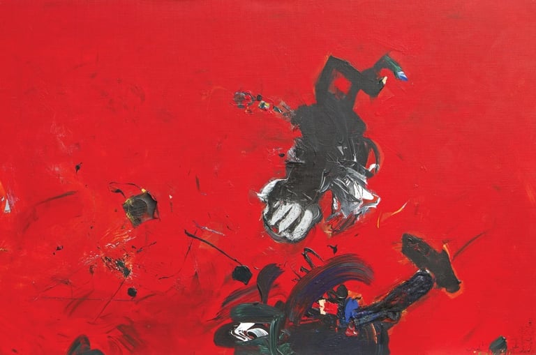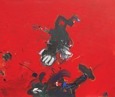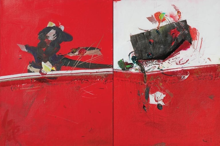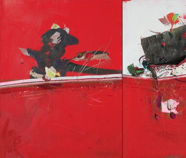 Kırmızıdaki Ortadoğu - 130 x 225 cm, Tuval Üzerine Akrilik Boya, Fırça ve Saç Kılı, Tuval Bezi Atıkları